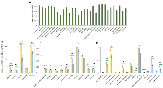 Metabolomic analysis in Arabidopsis thaliana plants with a ratio of treatment/control < 0.9. In 30-day-old plants (Col-0) after 48 h of EMF irradiation, the relative metabolite levels of treatment and control extracts were measured using GC–MS. Control samples are given in yellow, and the treated samples are in blue. (A) Overview of downregulated ratio of the relative metabolite content between treated and control extract metabolites (< 0.9, orange bar). (B) Metabolites present at high levels [r.u. mg−1 dry weight]. (C) Metabolites present at intermediate levels [r.u. mg−1 dry weight]. (D) Metabolites present at low levels [r.u. mg−1 dry weight]. Independent experiments = 3, n = 6, means ± SE, Student’s t-test, p < 0.01 **, and p < 0.05 *, indicated by green bars. There is a significant (p < 0.01/p < 0.05) downregulation of the metabolites between control (yellow) and treatment (blue).