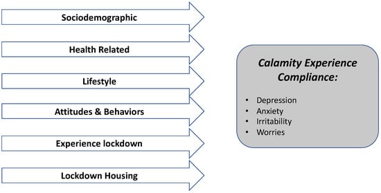 The present paper used sociodemographic variables; symptoms evolution with COVID-19 (global health perception, insomnia, depression, anxiety, burnout, and fatigue); morbidities worse or better with COVID-19; lifestyles related variables: quality of sleep, nightmares, eating behavior, dependences, physical activity (PA), and work volume before and after the COVID-19 pandemic. Attitudes and behaviors during COVID-19 (negative and positive), experience during lockdown, the Calamity Experience Check List (CECL), which is the average of four Visual Analogical Scales (VAS) from 1 (low) to 10 (high), describing several mental states: depression, anxiety, irritability, and worries related to uncertainty. The Calamity Experience Checklist (CECL) demonstrated a good internal consistency value α = 0.85. The adjustment index of the Confirmatory Factor Analysis (CFA) was good, and the model shows good adequacy. Wald test and Lagrange Multiplier test (LM test) analysis did not reveal necessary changes to the model found. The standardized solution obtained in the confirmatory analysis model allowed us to verify that, in general, the items present good saturation, varying between β = 0.55 and β = 0.89. The confirmatory factor analysis revealed a robust and adequate model; the explained variance and the residual (disturbance) were appropriate and ranged from R2 = 0.31 e R2 = 0.79 [10,14] for housing/geography.