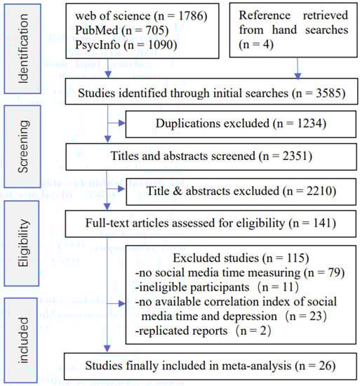 This study was conducted according to the PRISMA guidelines [] (see Table S1). Electronic databases, including Web of Science, PubMed, and PsycINFO, were searched systematically using title/abstract, and topic (through 9 January 2022) with no publication type or language restriction. To determine “social media” related search terms, a stratified searching strategy was adopted. Firstly, we searched the PubMed database using the most general terms of social media, such as “social media”, “digital media”, “social networking”, “SNS”, and “screen media”. Next, we screened all study titles and hundreds of abstracts, ending up with 56 different terms. Based on using frequency and generality, we divided them into two categories: general social media-related terms and specific social media-related terms. All general social media terms were included in the final search. However, some rarely used specific social media-related terms, such as “Digg”, and “Edmodo”, were deleted. Finally, three sets of medical subject terms (MeSH) and their combinations were used in the search, including “social media”, “social network*”, “SNS”, “digital media”, “screen media”, “online media”, “internet media”, “collaborative filtering site*”, “media sharing site*”, “Mashups”, “Facebook”, “Twitter”, “Instagram”, “YouTube”, “Snapchat”, “LinkedIn”, “WhatsApp”, “Pinterest”, “Blog”, “Wiki”, “Tumblr”, “Myspace”, “Google+”, “Reddit”, “WeChat”, “QQ”, “WordPress”, “Telegram”, “Flickr”, “Skype”, “Vine”, “Tweeting”, “podcasts”, “Tik Tok”, “Sermo”, “Google Groups”, “Forum and Blog”, “Second Life”; “depress*”; “adolescen*”, “juvenile*”, “teenager*”, “high school student*”, “middle school student*”, “children”. The asterisk indicates that the search was inclusive of larger words that contained the word or word fragment. Additionally, references of retrieved articles were screened.