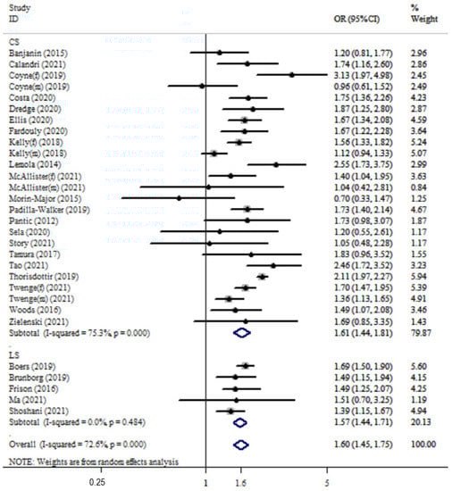 Forest plot of the association between time spent on social media (hours/day) and risk of depression in adolescents by study design. OR of depression for higher daily time using social media compared with reference groups and corresponding 95%CI. CS, cross-sectional; LS, longitudinal; f, female; m, male.