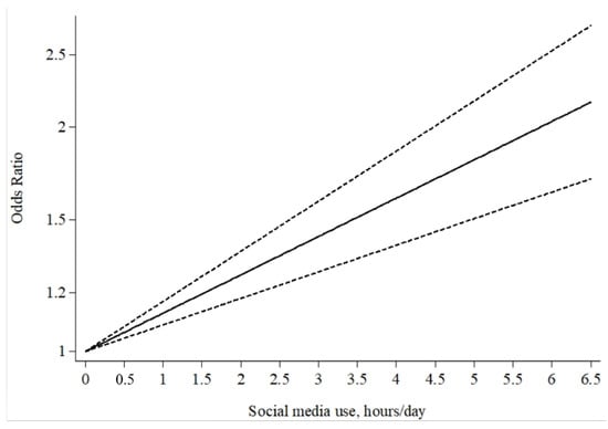 The generalized least squares trend estimated dose–response of time spent on social media and risk of depression in adolescents. Time of social media use was modelled with a restricted cubic spline in a two-stage random-effects dose–response model. The ORs are plotted on the log scale. Dashed lines represent the 95%CIs for the spline model. No social media use served as the referent category.