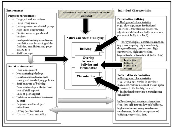 Similarly, while the black arrow leading from the outer ‘environmental box’ to the outer ‘nature and extent of bullying box’ indicates that both the physical and social environment will influence the overall nature and extent of bullying in the facility (including the nature and prevalence of bullying and victimisation, and the overlap between the two), the black arrows leading from the ‘potential for bullying box’ and the ‘potential for victimisation box’ are more specific and indicate that the former will increase the likelihood of bullying, whereas the latter will increase the likelihood of victimisation. The black arrow leading from the ‘interaction between bullies and victims box’ indicates that the interaction between bullies and victims (in the context of the special residential group dynamics) is likely to be particularly important in shaping the overlap between bullying and victimisation, while the black arrow leading from ‘the interaction between the environment and individual’ box indicates that the interaction between the environment and the individual will influence the overall nature and extent of bullying in the facility (i.e., bullying, victimisation and the overlap).