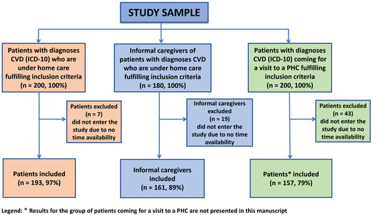 Invitations to the study were sent to the heads of ten primary health care centers in Opole, Lubelskie, Mazovia, Dolnośląskie, and Podlaskie voivodeships. Eight of them responded positively, so only patients from these centers were included in the study. The family nurse practitioner identified patients for the study according to the inclusion criteria. Chronic CVD was defined based on the primary care history (primary care physician diagnosis). Two hundred patients with CVD who were cared for at home by family members and one hundred eighty informal caregivers were invited to participate in the study. The final sample of participants was determined based on their time availability. Ultimately, 193 (97%) patients participated in the survey and 161 (89%) of their informal caregivers. Patients and their caregivers were encouraged to participate in the study by a family nurse practitioner during scheduled home visits. The family nurse practitioner conducted an interview with the patient and his or her informal caregiver in which she introduced the purpose and method of the study and obtained preliminary verbal consent. Both patients and caregivers received a set of questionnaires and a written informed consent form to participate in the study. Caregivers and nurses completed an additional questionnaire about the patient (i.e., paired questionnaires about the same patient). For patients, the following criteria for participation in the study applied: they had to be at least 18 years old, have received a CVD diagnosis (ICD-10 codes) at least 12 months before the study, and live at home under the care of a family caregiver. For informal caregivers, the following criteria for participation in the study applied: at least 18 years of age and caring for a patient with chronic cardiovascular disease outside the home care setting for at least 12 months before the study. The exclusion criteria (disqualification by family caregivers) in both groups were cognitive impairment and other severe mental illness and/or other difficulties preventing active participation in the study. The final number of participants was based on their time availability. Ultimately, 193 patients and 161 informal caregivers participated in the survey. The sample group selection is shown in Figure 1.
