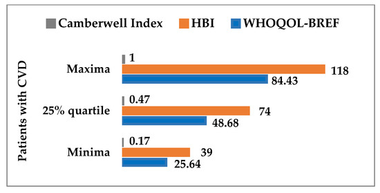 There are several limitations to this study. The first crucial limitation of the study stems from the small sample group analyzed and conducting research in five voivodeships in Poland. This fact may significantly limit the possibility of generalizing the results to the overall population of CVD patients. It is worthwhile to study a larger group of patients and their caregivers, as well as a larger number of PHC clinics across the country. Second, the patient was included in the HEHC group when his results of WHOQOL-BREF), HBI, and the Camberwell index were higher than the corresponding values of 25% of the quantiles (first quartiles) of these three variables. Otherwise, the patient was included in the LEHC group. The non-complementarity of both groups results from the lack of data. The analogous criterion for the median (50% quantile) had a drawback: the number of one group was three times that of the other. Another limitation could be that, since we wanted to examine all possible models, we had to somehow limit the number of explanatory variables. The variables that were significantly correlated with the EHC variable at the 0.05 level were selected for logistic regression analysis because there were many more correlating variables at the 0.1 level. The next limitation could be low values of the pseudo-R2 indicator, which assesses the prediction of an explained variable using a model. The presented results of logistic regression analysis should be taken with caution because the pseudo coefficients of R-squared (coefficient of determination), which measure how well the model explains the collected data, are not large (0.23–0.39). Further research should seriously consider all of the above limitations.
