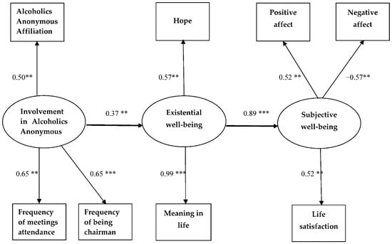 Recovery mechanisms were explored by using potential mediators between AA attendance and alcohol consumption by Kelly et al. []. Among aftercare patients, AA attendance indirectly improved the percentage of days abstinent via positive social self-efficacy, spiritual/religious practices, pro-abstinence social networks, and pro-drinking social networks. In the same group of patients, mediators between AA attendance and reduced drinks per drinking day were positive social self-efficacy, negative affect, spiritual/religious practices, depression, and pro-drinking social networks. Among outpatients, relationships between AA attendance and reduced drinks per drinking day as well as percentage of days abstinent were mediated by pro-abstinence social networks, pro-drinking social networks, and positive social self-efficacy []. In Blonigen et al. []), longer AA participation duration was related to decreased impulsivity (from baseline to one year), which in turn led to a reduction in alcohol-use problems, improvement in social support, improvement in self-efficacy to resist drinking as well as improvement in emotional discharge coping. In their longitudinal research, Kaskutas et al. [] proved that involvement in AA both directly and indirectly—through support from other AA participants—influenced lower alcohol consumption and less severe problems. This effect was noticed both at the start and after 30 days of abstinence. Besides social and cognitive mechanisms of change as a result of involvement in AA, the literature also describes a spiritual mechanism of change. According to this mechanism, involvement in AA has a positive, indirect influence on reducing alcohol consumption through spirituality/religiousness [,,,]. Spirituality and religiousness are similar and overlapping constructs, but spirituality is a wider conception includes religiousness as one form of express spirituality []. The spiritual growth of AA participants is based on AA involvement and/or religiousness. These forms can be used for religiously inclined individuals, but for religious skeptics, agnostics, and atheists, involvement in AA as a secular way of developing spirituality is preferred. According to Kurtz and White [], this first mechanism of spiritual growth called secular spirituality emphasizes the role of secular values, and the second one—religious spirituality, focuses on religious values. In this study, the spiritual mechanism was tested using involvement in AA as a manifestation of secular spirituality, which through existential well-being [,] is related to subjective well-being.