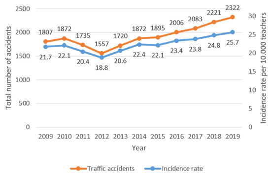 Figure 1 shows that the number of traffic accidents suffered by teachers increased year by year. Although the total number of teachers also rose, the increase in the total number of accidents was higher.