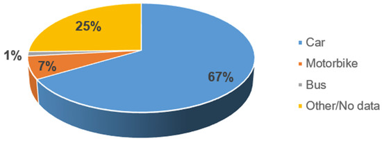 In addition, occupational traffic accidents notified by teachers were classified according to the vehicle or transportation involved in the crash. As shown in Figure 3, the majority of accidents involved cars and motorbikes.