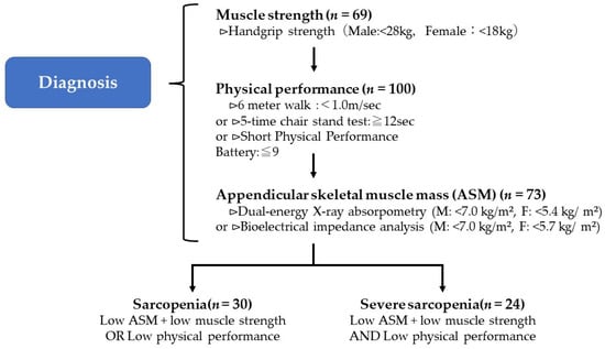 Appendicular skeletal muscle mass was measured using a body composition analyzer, InBody470 (InBody Japan, Tokyo, Japan). Skeletal muscle mass loss was defined as less than 7.0 kg/m2 in men and less than 5.7 kg/m2 in women. Based on the results from Section 2.4.1, Section 2.4.2 and Section 2.4.3, the participants were classified into three groups, including the normal, sarcopenia, and severe sarcopenia groups, according to the Asian Working Group for Sarcopenia 2019 (AWGS2019) criteria [] (Figure 2).
