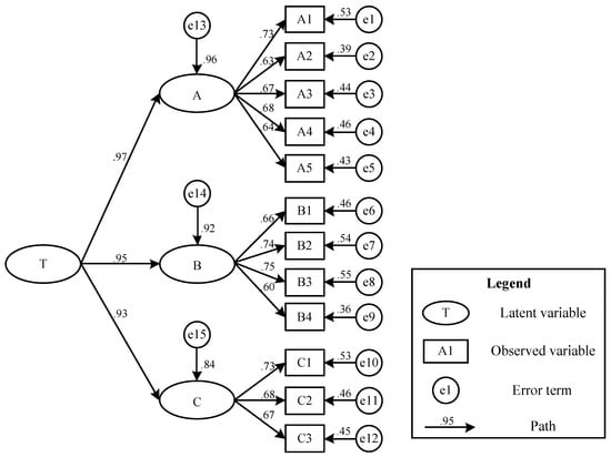In Equation (4), p and q are the numbers of exogenous and endogenous observed variables, respectively. Using Equation (4), the number of hypothetical models’ observed data Df = 18 × 19/2 = 171, Df − t = 171 − 46 > 0 can be analyzed further.