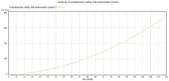 Assuming that the construction time is 120 months, Vensim software is used for system dynamics analysis and simulation. As a result, the comprehensive risk level of the construction site in a typhoon environment and the risk changes in different stages under the joint action of multiple factors are obtained, as shown in Figure 4 and Figure 5.
