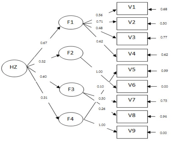 Univariate outlier and multivariate outlier tests were performed to prevent misinterpretation of the results. Univariate outlier values were used to calculate standardized scores (|z| ≥ 3.30), whereas multivariate outlier values were used for finding Mahalanobis distance (p < 0.001). Results showed that no study subjects exhibited a z score of ≥3.30 as an outlier, but 8 of the total subjects had Mahalanobis distance (p < 0.001). We determined to continue our study with a total number of 442 study subjects. Data distribution of each question listed in 9 sections of the Thai-HFHAT was examined and a normal distribution was indicated by the graph depicting a bell curve. Maximum likelihood estimation was conducted in the confirmatory factor analysis based on skewness of 2 or less and kurtosis of 7 or less []. Our results showed that skewness values were in a range of −0.110–1.385 and kurtosis was in a range of −1.886–0.896. The Kaiser–Meyer–Olkin measure of sampling adequacy was also conducted to determine the suitability or adequacy of data to be used for factor analysis []. Results from the measurement indicated that our data was suited for the analysis (0.679). Bartlett’s test of sphericity was conducted in the phase I study to test the hypothesis that the correlation matrix was an identity matrix, which showed a true association between questions. Chi-square was used to interpret the results (p < 0.05). Results showed that χ2 was 466.54 (p < 0.001), indicating that the set of data could be used for confirmatory factor analysis.