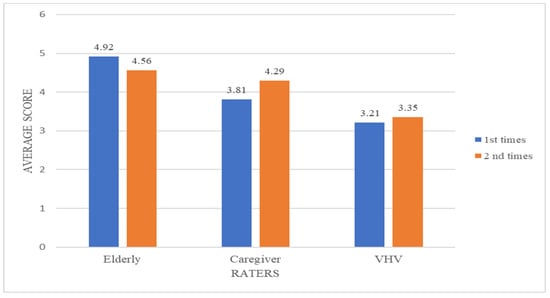 The means scores for the Thai-HFHAT-SF by the elderly group, the caregiver group, and the VHV group were slightly different between the 1st and 2nd home visits. This may contribute to the environment in the homes of the elderly or behavior changes of the elderly after the first home visit. As the elderly completed the first-time rating of the tool, they may pay more attention to their surroundings and make some changes to the environment to make their home safer []. This phenomenon is called reactivity and can happen to study subjects when the instrument is administered multiple times []. The mean of ratings by the caregiver group and the VHV group was higher from the first-time visit. This was possible because both groups of the raters considered that the change made to the home environment did not affect home hazards that the elderly had to encounter.
