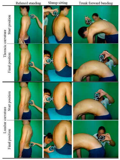 Following the previously described method [16], the sagittal spinal alignment (thoracic and lumbar curves) or morphotype was assessed in the main positions that children may adopt in everyday life, such as slump sitting posture (SSP), the relaxed standing posture (RSP) and the maximum trunk forward flexion posture (MTFP) (Figure 1). An inclinometer (ISOMED, Inc., Portland, OR, USA) was used to quantify the sagittal spinal curves, which has high reproducibility and validity and shows a good correlation with radiography [17].