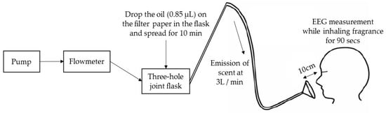 Aroma oils (0.85 µL, the concentration was set by referring to the treatment method of previous studies []) were injected using a micro-cylinder (80330; Hamilton; Hwashin Instrument Co., Seoul, Korea) into a three-hole joint flask (FJ1140-3000D; LABDIA; Seoul, Korea) and was dropped on a filter in the flask and diffused for 10 min. The piston pump (10RNS; G&M Tech Inc.; Yongin, Korea) was then operated and injected along the hose at a flow rate of 3 L/min, and the participants were instructed to breathe naturally through the attached glass funnels under their noses at intervals of 10 cm with their eyes closed (Figure 1).