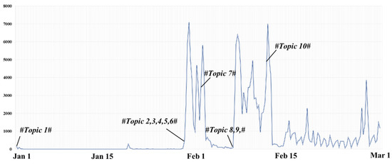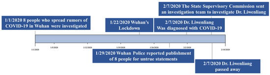 Wuhan, Hubei Province had been monitoring influenza and related diseases in December 2019 and had identified several cases of viral pneumonia, all of which had been diagnosed as viral pneumonia/lung infection. On 30 December 2019, Dr. Li Wenliang announced in a clinical 04 class group at Wuhan University that “seven cases of SARS have been confirmed in the seafood market of South China” and reminded fellow clinicians to “pay attention to their families and relatives”. An hour later, he added that “the latest news is that a coronavirus infection has been confirmed and virus typing was under way.” On 3 January 2020, he was warned and admonished by the local police station for “making false statements on the internet”. Dr. Li Wenliang was consequently diagnosed with COVID-19 on 31 January (posted on 1 February through his Weibo), and an official report on 7 February confirmed that Li Wenliang had died at only 34 years old. On 7 February 2020, with the approval of the Central Committee, the National Supervisory Commission decided to send an investigation team to Wuhan, Hubei Province, to conduct a comprehensive investigation into the problems reported by the public involving Dr. Li Wenliang. This event quickly attracted the wide attention from users on the Chinese social media platforms Sina-Weibo, WeChat, Tik-Tok, and Zhihu, with many people expressing their deep condolences for Dr. Li’s misfortune and raising questions about the government’s actions. Table 1 summarizes the top 10 focal topics in chronological order, with the entire event timeline shown in Figure 1.