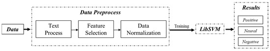 Support vector machines (SVMs) are a type of supervised machine learning method which is often used for classification. It has a solid theoretical foundation and has been developed rapidly since 1990s and has derived a series of improved and extended algorithms, which is also a common machine learning method for classification that has been widely used for text classification [38] and sentiment analysis [11,39]. Many researchers have proposed that support vector machine may be the most accurate text classification method [40]. In this paper, we first carried out text processing, feature selection, and data normalization, and then achieved the emotion classification model through SVM training. This paper uses the open source LIBSVM model to avoid the instability of development. In the training process, we used the cross-validation parameter optimization method, and selected RBF as the kernel function through experiments, the data were then applied for the sentiment tendency discrimination to divide the sentiment messages into positive, negative, and neutral labels (Figure 3). Python and MATLAB programming languages were used for the data processing.