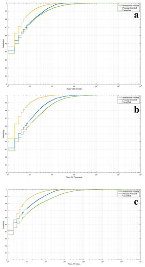 CDF for the Forwards (a), Comments (b), Likes (c) from the different account types.