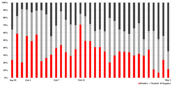 An emotional classification and a timeline trend analysis of the developments related to the “Dr. Li Wenliang” event in the 190,627 messages were conducted based on the focal topic public opinion developments by the different user types. The user messages were divided into positive, negative and neutral categories and as few people had paid much attention to “Dr. Li Wenliang” before 29 January 2020, the change trends in the three emotions were tracked from 29 January 2020 to 1 March 2020. Figure 8 shows the proportion of three emotions per day from 29 January 2020 to 1 March 2020, from which it can be seen that the negative emotions were sustained for a longer time in the development of public opinion. When the “Dr. Li Wenliang” topic first arose, most users expressed dissatisfaction; however, when the official agency verified account @PeaceWuhan issued a timely announcement in response to the incident on 30 January, there was a rapid decline. Other institutional-verified accounts immediately issued many messages and the expert Zeng Guang evaluated Dr. Li Wenliang positively in an interview with CCTV (China Central Television) @CCTVNews, which appeared to be an official attempt to calm things down, with an interview from the national press and a government response also being published.