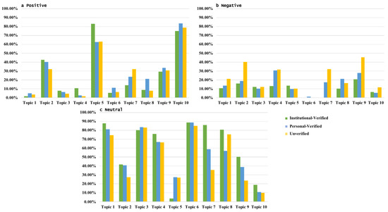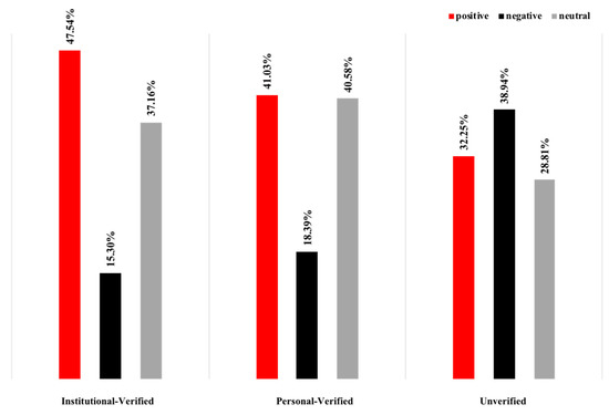 Overall, there were significant differences in the emotions expressed by the three accounts throughout the event. The verified accounts posted mostly positive messages, whereas the unverified users expressed strong negative emotions (Figure 9). Figure 10 shows the various emotional proportions for the three account types for the different focal topics, from which it can be seen that the verified account emotions varied little and tended to be mainly positive and the unverified account emotions also varied little but tended to be negative across almost all topics, with most unverified users being very clear about their attitudes and clearly regarding Sina-Weibo as a platform for emotional expression. However, while the verified accounts expressed both positive and neutral views, these were mainly associated with facts as Sina-Weibo’s main function was seen as information/news dissemination.
