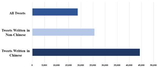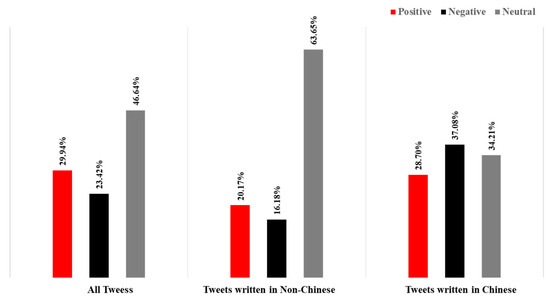 In addition to the emotional analysis of the data from Sina-Weibo, we also captured the data from Twitter, a more widely used platform in the world, for comparative study. We collected 44,309 tweets with the keyword “Li Wenliang”. In order to better understand the real views of the people in other countries on the “Li Wenliang” incident, we divided all tweets into “Chinese” and “Non-Chinese” categories. After statistics, the number of two analogies was 25,607 and 18,702, respectively (Figure 13). Figure 14 shows the overall sentiment classification results and the sentiment analysis of the two analogues. In all the tweets published in Chinese, negative emotions dominate, which is similar to the emotional expression of the unverified accounts of Sina-Weibo. Due to the Internet restrictions on twitter in China, it is safe to assume that think that the overseas Chinese are basically in line with the domestic people on this matter. In all Non-Chinese tweets, neutral emotion is dominant, and its emotional expression is similar to that of verified users on Sina-Weibo. By looking at these tweets, we found that most of them were media reports, so the emotion is relatively objective. In the positive mood, many people expressed their prayers and sympathy for Dr. Li Wenliang, while in the negative part, they expressed more distrust of the government and anger at the death of Dr. Li Wenliang.