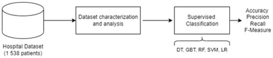 Microsoft Excel (version 2016) and IBM SPSS (Statistical Package for Social Science) Statistics (version 27) were used to study the dataset. In particular, a Pareto diagram was created using MS Excel v2016 Software, while statistical analysis was implemented with the support of IBM SPSS Statistics v27 Software. First, the distribution was tested using the Kolmogorov–Smirnov test, with a significance level of 95%. For each variable, the distribution normality was not demonstrated. For this reason, the Mann–Whitney U test (MW), the Kruskal–Wallis test and the chi-squared test, with a 95% confidence interval, were used. For the dataset consisting of stroke patients only, after performing the comparative statistical analysis, 5 ML algorithms—decision trees (DT), random forest (RF), support vector machine (SVM), logistic regression (LR) and gradient boosted trees (GBT)—were implemented to verify the possibility of classifying patients between the two identified classes. To do this, a Python script was created.