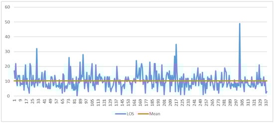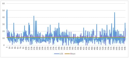 Lastly, Figure 5 reports the change in LOS in days for all 650 observations relating to stroke patients in the 2 years 2018–2019. The orange line shows the average value of 11.19 days.