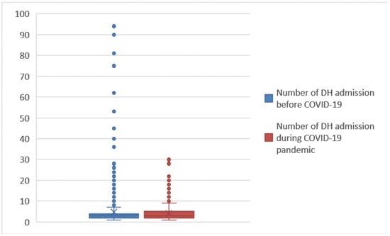 Box plot of number of DH admissions (2018–2019 vs. 2020–2021).