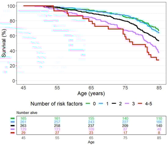 Early population-based cohort studies offer a unique possibility to study the effect of multiple risk factors in midlife on survival to advanced ages. Some of the first to conduct such a study were Terry et al., who examined the association between cardiovascular risk factors measured at the ages of 40–50 years and survival to the age of 85 in the Framingham Heart Study (FHS) []. The results showed the predictive power of a simple risk score, formed by counting the number of risk factors, e.g., women with all risk factors (five in that study) had a 14% chance of reaching the age of 85 compared to 65% among those with no risk factors []. The importance of midlife risk factors on longevity was later confirmed in studies including men only [,,,]. However, to the best of our knowledge, research on the association between number of risk factors in midlife and survival to old age in women is scarce.
