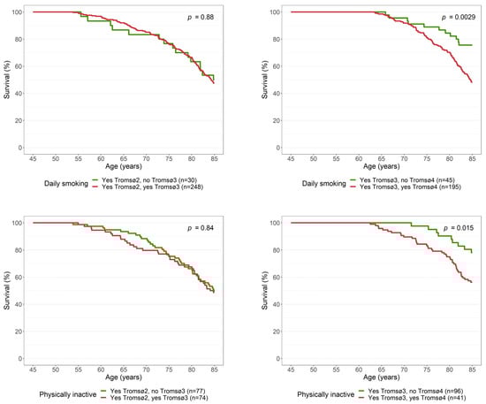 We observed no statistically significant difference in survival to age 85 between daily smokers who did and did not quit smoking between Tromsø2 and Tromsø3 (Figure 4). However, we did observe a difference in survival between daily smokers who did and did not quit smoking between Tromsø3 and Tromsø4, with higher survival among those who quit. A similar pattern was observed for changes in physical inactivity: no difference was observed between physically inactive women who did and did not become physically active between Tromsø2 and Tromsø3, but a significant difference was revealed between Tromsø3 and Tromsø4. Among those who reported physical inactivity at Tromsø3, those who became physically active at Tromsø4 had higher survival than those who remained physically inactive. However, it is important to note that the questions regarding physical activity were different in Tromsø4 than in Tromsø2 and Tromsø3. Adjusting for baseline covariates did not change these results (Table 3).