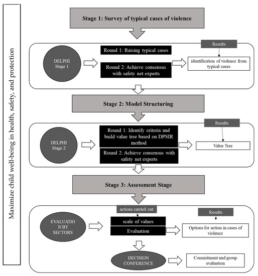 Stage 3. This stage is referred to as the evaluation phase of the MACBETH Model and it is divided into two parts: (i) an evaluation of the model criteria in each sector of the protection network, and (ii) a decision conference with all sectors involved in this research. In the first part, the evaluations in each sector were carried out through face-to-face meetings where each one analyzed the differences in attractiveness of the criteria, according to the specific case and to the MACBETH method. In the second part, a group evaluation was carried out through a decision conference. The decision conference aimed to present the results of all sectors involved, without identifying cases individually, to obtain a commitment to the results of the model and to analyze the impacts of applying the method in the context of the problem: sexual violence against children and adolescents. Figure 1 shows the methodological framework applied in this research.