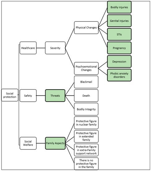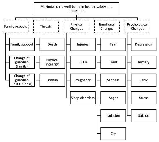 The questions developed for this stage, using the DPSIR method, of the modified Delphi were established by observing the typical cases reported in the first round. The results were organized as keywords and organized in a tree map, as shown in Figure 2. At the first level, the objective of the tree map focused on values defined by the expert panel through the guarantees of health, safety, and protection. Afterwards, five areas of concern were defined: family aspects, threats, and physical, emotional, and psychological changes. The other factors were then allocated according to their association with one of the five areas of concern.