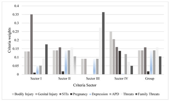 In light of the view from the group of professionals, faced with all the opinions provided in the Sectors, the classification obtained is given in decreasing order. Figure 4 shows the criteria weights based on the evaluation of each Sector and the Group. It was observed that the “STIs” criterion had the highest score for Units I (0.3505) and II (0.1578). The “Threat” criterion had the same score as the STI criterion in Unit II and the second highest score in Unit III (0.2728). “Depression”, “Phobic anxiety disorder”, “genital injuries”, and “bodily injuries” shared the same score in the view of the group (0.1404). The highest score found in all models was for “Family aspects” in Unit III (0.3636). Sector III did not feel comfortable answering questions about STIs and pregnancy because they understand that they are aspects related to health.
