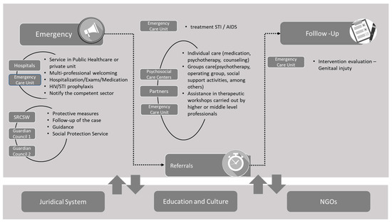 As the studies by Avanci, Pinto and Assis [33] and Rodrigues et al. [34] highlight, most acts of violence, especially physical (self-inflicted, beatings) and sexual (rapes and abuse) violence, involve healthcare services, especially emergency services, as highlighted by the WHO Report on Violence [1]. In addition, as recommended by the Statute of Children and Adolescents, in the Brazilian case, other sectors and their respective equipment will be activated, including Social Protection (Basic and/or Medium Complexity), Justice System (Public Ministry, Children’s Court), Education (Child or Elementary), Mental Health (Psychosocial Care Centers), and the Guardian Council itself, among others [35].