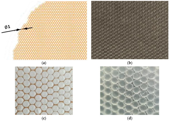 During curing, geometric modification of the produced rubber mixes was carried out using an auxiliary geometrised matrix placed in moulds as a spacer. The template used in geometrisation consisted of flat-bottom holes, Ø 1 mm diameter and 0.8 mm deep. The matrix was made with a CNC machine. The design and the actual matrix are shown in Figure 1.