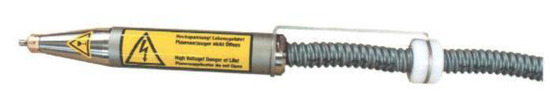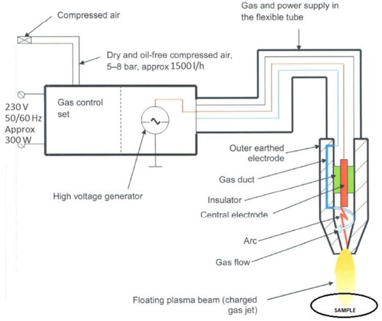 The polymer samples were plasma-modified with Diener apparatus, Plasma Beam Standard model (Germany), with 300 W power and 10 kV generator voltage. Two gases were used for the modifications: air and argon. Pressurised (5–8 bar) compressed air (cooling gas) was used. The processes were carried out at the feed rate of 5 cm/s and the beam travel stroke of 1.5 cm. The modified sample’s distance from the nozzle was 2 cm. Figure 2 shows a diagram of the equipment used. Figure 3 shows the nozzle used for the modification.