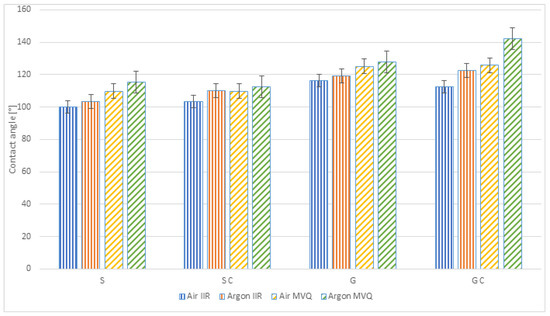 Higher contact angle values before plasma modifications were obtained for silicone rubber samples, as shown in Figure 4. For the MVQ, the contact angle values amounted to 98°, while their value for the IIR was 90°. Plasma modification, using air and argon, increased the contact angle value for both types of rubber. For the IIR, the increase from 90° was observed by 10% for plasma using air and by 15% when argon was used. For the MVQ, a higher increase was observed—by 18% and 22%, respectively.