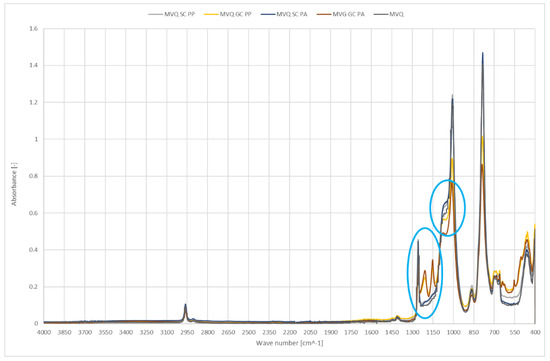 IR spectra of polymer materials made of silicone rubber (SC—chemically modified smooth samples, GC—chemically modified geometrised samples subjected to plasma modification in the air (PP) or argon (PA), and for non-modified polymer material made of silicone rubber).