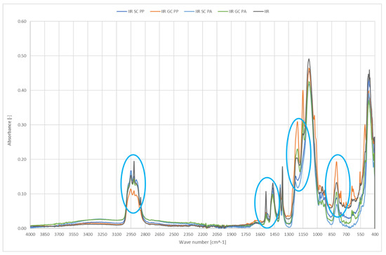 IR spectra of polymer materials made of butyl rubber (SC—chemically modified smooth samples, GC—chemically modified geometrised samples subjected to plasma modification in the air (PP) or argon (PA), and for non-modified polymer material made of butyl rubber).