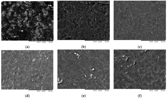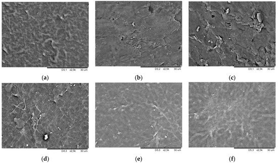 Surface morphology SEM image of butyl rubber smooth samples (a) chemically non-modified, (b) plasma-modified in the air, (c) plasma-modified in argon, (d) chemically modified, (e) chemically and plasma-modified in the air, and (f) chemically and plasma-modified in argon.