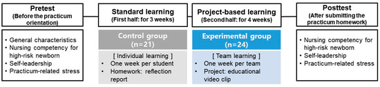 Thus, this study aimed to develop a PjBL program on high-risk newborn care for nursing students, and to evaluate its effects on nursing competency for high-risk newborns, self-leadership, and practicum-related stress. This study is significant in that it applied PjBL to NICU clinical practice, which is expected to encourage nursing students to engage in active learning during clinical practice while producing meaningful outcomes.