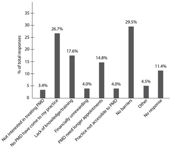| My practice is not accessible to PMD | 5 (4.3) | 2 (3.32) |
