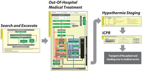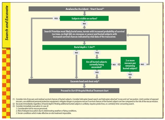 Medical treatment is initiated as quickly as possible, since every additional minute reduces survival chance by 2 to 3% for 58% of buried subjects in our database who were excavated within the first 35 min after an avalanche. Therefore, we had to identify the priorities and define the procedures for the last phase of excavation in close proximity to the patient. Once the first medical assessment is possible, two new fields of interest open up in the case of multiple buried subjects present during a shortage of resources. First, does the patient require immediate medical treatment—and might it even be possible to use this first patient to assist in the ongoing rescue? In the second case where the initial assessment shows that the patient is not awake, does not give clear answers, or is injured, we evaluated in which chronological sequence further medical assessments and potential life-saving treatments should be performed. Special attention has been paid to the fact that the vast majority of buried subjects quickly develop severe respiratory depression. This led to an evaluation of the most suitable interventions for asphyxiating patients, a process matched with a drowning patient, which is the closest proxy to the avalanche patient. Drowning accidents are much more frequent globally compared to avalanche accidents; thus, much more research has been invested in the research and guidelines for the treatment of drowning patients. Given that the pathophysiology of asphyxia in drowning and avalanche burials approximate one another, our results and conclusions for an optimal treatment of a suffocating avalanche patient closely follow the conclusions of the guidelines for drowning patients [13].