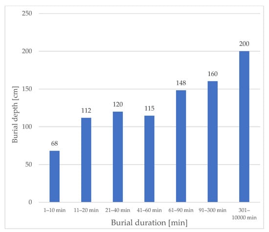 In a first step, we calculated the mean burial depth of excavated subjects for multiple ranges of burial duration based on the 1070 full burial dataset from France, Austria and Switzerland. This data is required to connect the survival chance derived from the Haegeli et al. survival curve to the mean burial depth of a specific burial duration range [5]. None of the existing survival curves for fully buried subjects differentiate between different burial depths; therefore, the probability of survival for any given burial duration always includes buried subjects at different burial depths. However, as excavation performance by rescuers is similar and mechanical properties of debris of different avalanches equally have similarities, mean values of burial depths of excavated patients could not be assumed as equal for all burial durations.