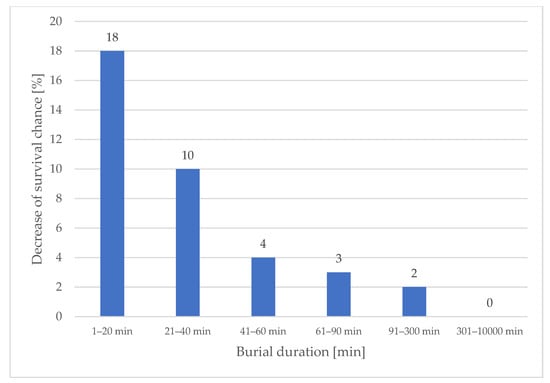 According to European data, survival chances drop by 70% within the first 35 min of burial duration, thus a decrease of 2% per minute [5]. Taking only the period from 15 to 35 min into account, the decrease is almost 3% per minute. This dramatic reduction in survival shows that avalanche accidents are amongst the most urgent emergencies in mountain rescue because every single minute counts. Of all avalanche victims in Canada, 81.1% die due to cardiac arrest from asphyxia, 18.9% due to traumatic cardiac arrest [5]. In Europe, the causes of death are similar, with few succumbing to primary hypothermic cardiac arrest [8]. Traumatic cardiac arrest is the by far most unlikely cause to be survivable in a mountain environment (0.8–1.2% for non-mountain related accidents) [9], and treatment options for BLS-trained rescuers are very limited. A lack of oxygen is responsible for the 70% suffering from asphyxia leading to cardiac arrest, mostly within the first 60 min of burial. Hypothermic cardiac arrest tends to occur after 60 min of burial duration, which deserves closer attention [10,11].