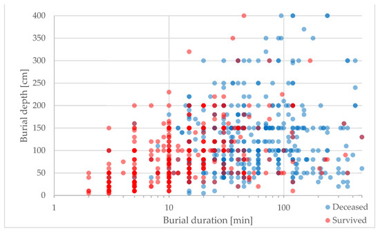 Survival chances based on burial duration and burial depth (N = 1070). The saturation of red for survived and blue for deceased cases increases with the increase in number of cases. For datapoints including survived and deceased cases, the gradually changing shading between red and blue is used to visualize the distribution of survived and deceased cases.