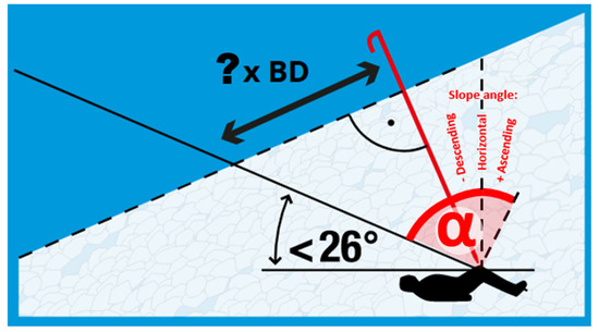 Required length of the snow conveyor belt (tan α) relative to slope inclination. The ramp angle of the snow conveyor belt must remain lower than 26° to prevent the snow to keep falling back towards the probe (empiric field test data [16]) and thus to ensure an efficient excavation effort. Illustration: www.MountainSafety.info as of 31 December 2021, reprinted with permission of www.MountainSafety.info.