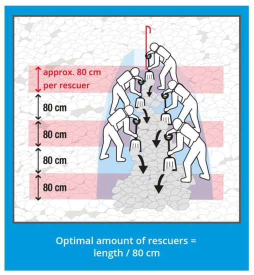 Optimal number of rescuers for efficient excavation applying the snow conveyor belt technique [16]. Illustration: www.MountainSafety.info as of 31 December 2021, reprinted with permission of www.MountainSafety.info.