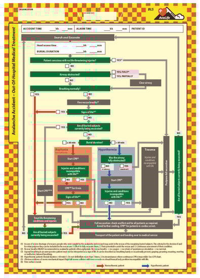 - Kottmann, A.; Blancher, M.; Pasquier, M.; Brugger, H. Avalanche Victim Resuscitation Checklist adaption to the 2015 ERC Resuscitation guidelines. Resuscitation 2017, 113, e3–e4. [Google Scholar] [CrossRef] [PubMed] [Green Version]