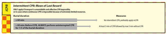 In case avalanche patients in cardiac arrest with a core temperature < 28 °C need to be transported under conditions not allowing efficient CPR due to extreme shortage of resources, intermittent CPR (iCPR) may be considered (Figure 9) [15].