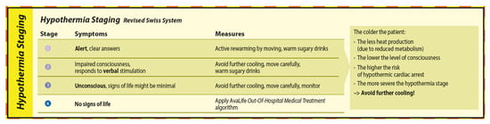 - Musi, M.E.; Sheets, A.; Zafren, K.; Brugger, H.; Paal, P.; Holzl, N.; Pasquier, M. Clinical staging of accidental hypothermia: The Revised Swiss System: Recommendation of the International Commission for Mountain Emergency Medicine (ICAR MedCom). Resuscitation 2021, 162, 182–187. [Google Scholar] [CrossRef] [PubMed]